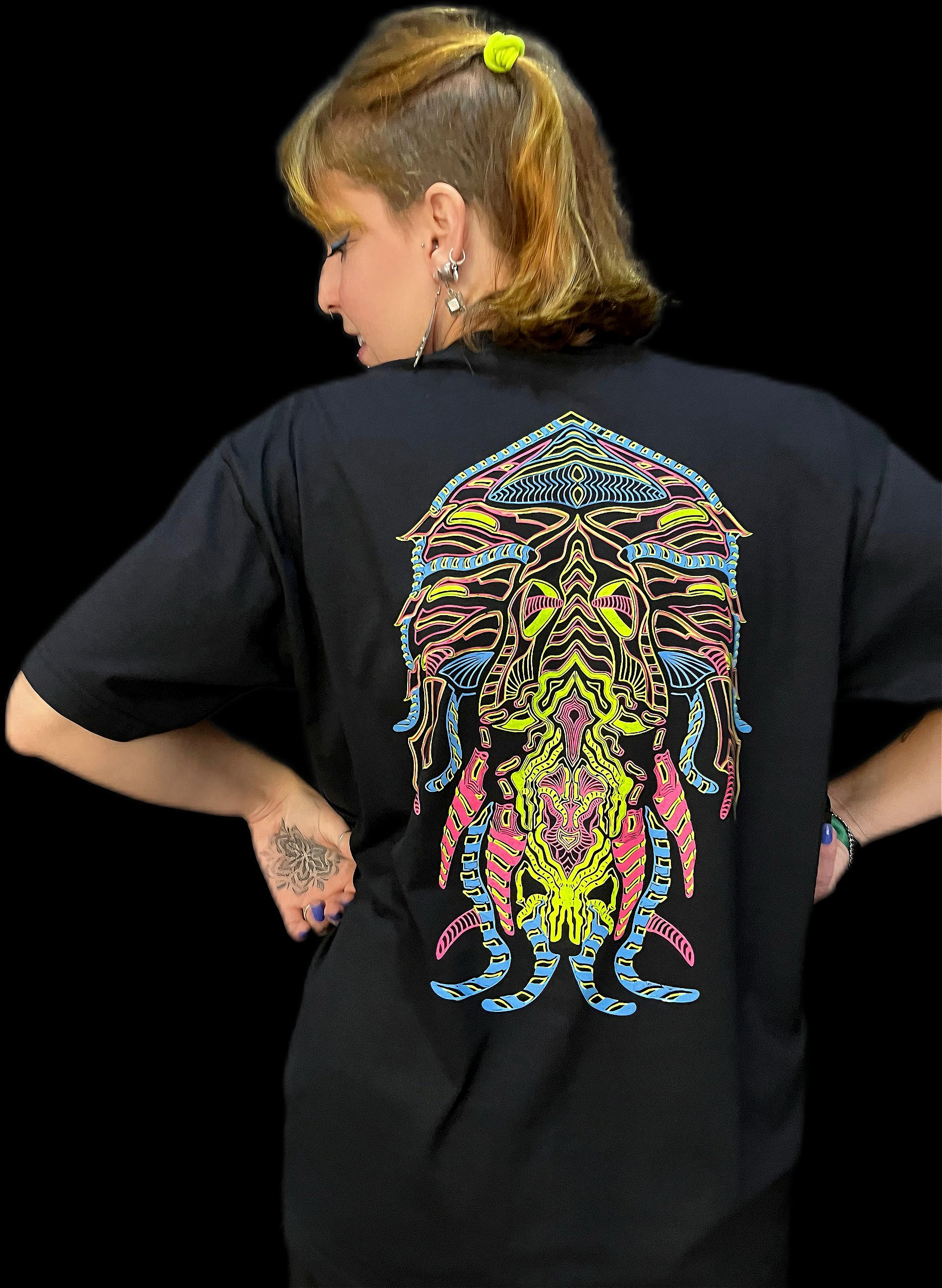 Camiseta Jellyfish é uma peça produzida em camiseta preta, com excelente acabamento de costura e malha de primeiríssima qualidade, com fio 30/1 compactada e pré encolhida no tingimento (GRAMATURA 165), estampa exclusiva com arte que reage a luz negra, malha preta e estampa com três cores.